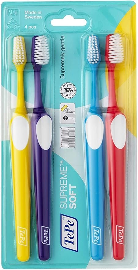 Experience gentle yet thorough cleaning with the TePe Supreme adult toothbrush. Its longer, soft filaments reach deep between teeth, while the ergonomic, non slip handle ensures a comfortable and secure brushing experience .